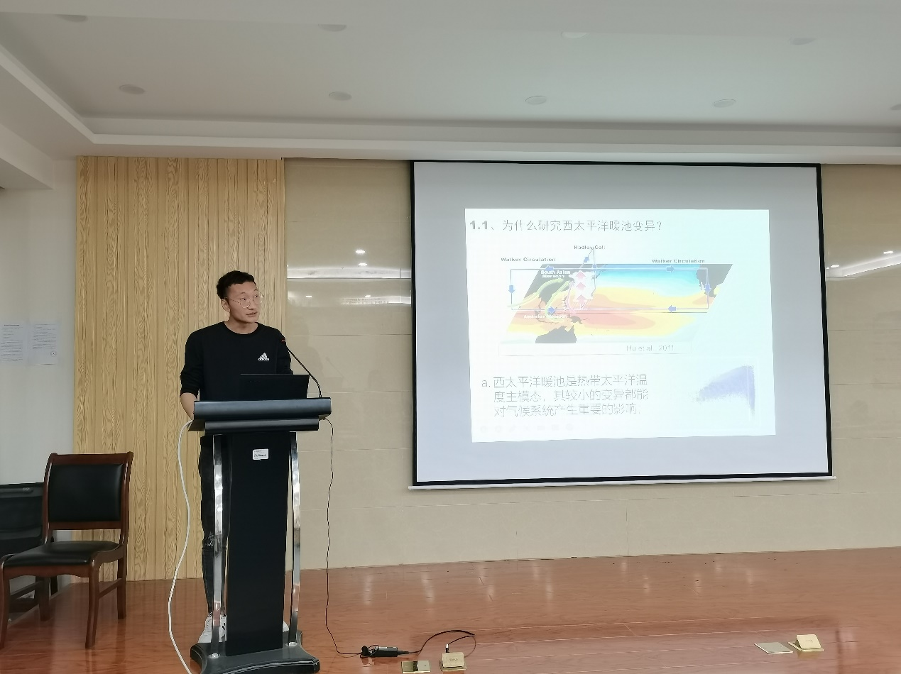 在本次研究生讲坛中,本期的主讲人孙其明主要讲述了西太平洋暖池的变异及其机制研究。首先孙其明对西太平洋暖池研究进行了简单地介绍,阐述了暖池的气候态特征及形成机制并提出了若干相关的科学问题。其次,孙其明以西太平洋暖池变异及其物理机制为核心应用数据分析与理论诊断相结合的方法对所提问题进行研究。随后,孙其明利用合成分析方法诊断了WPWP强度年际变化的物理机制,发现在年代际以上时间尺度上,二维暖池热心和三维暖池热心具有很好的相关性。在论坛分享的过程中,孙其明还向同学们生动形象地介绍了西太平洋暖池“分裂”这一独特现象。最后,孙其明对西太平洋暖池的多尺度变异进行了总结并对尚存的问题分享了自己的思考。