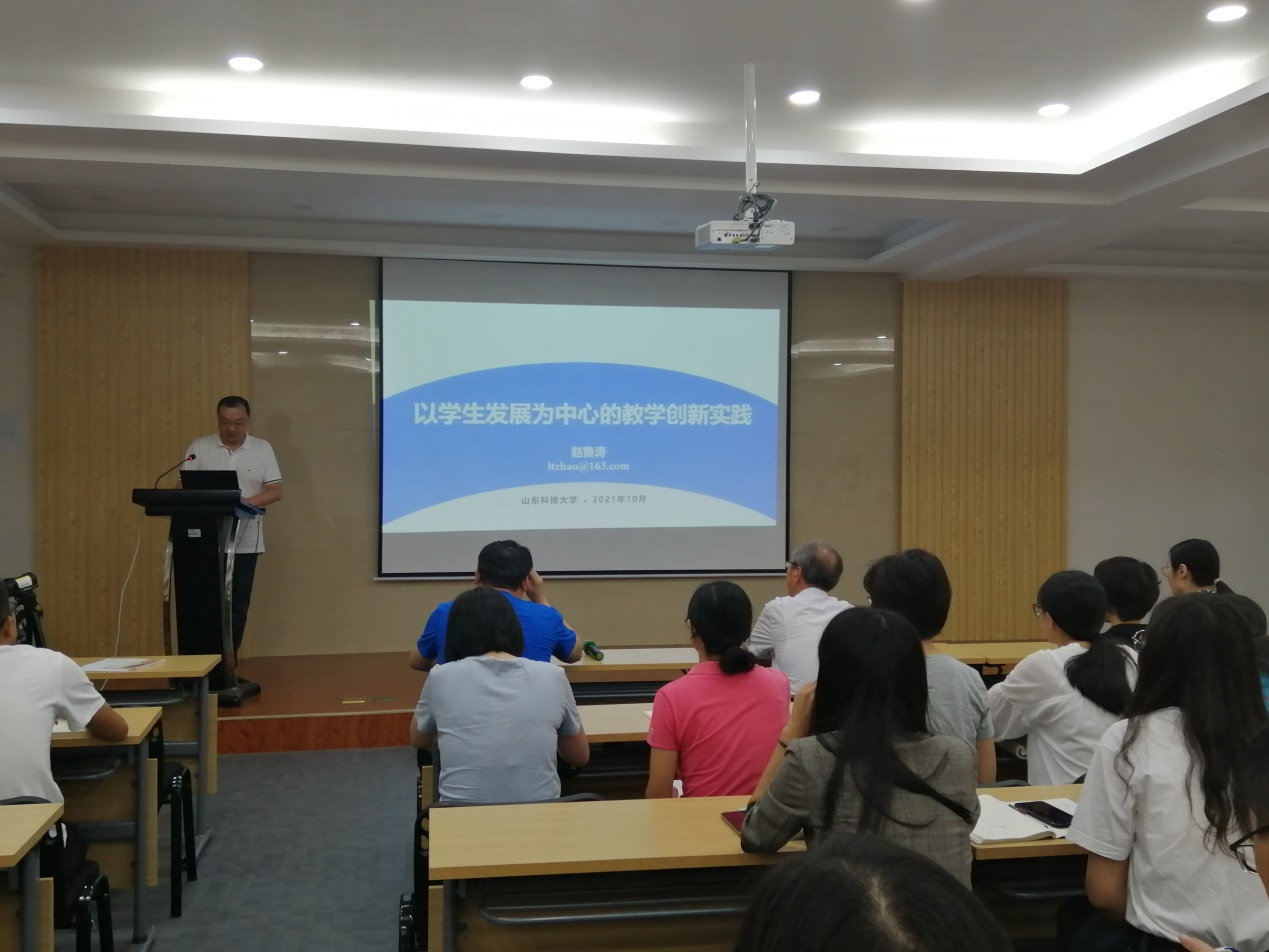 赵教授从教学内容、教学手段、教学模式、教学评价等方面详细介绍了团队的创新研究与实践,并分享了《概率论与数理统计》一流课程建设经验。此外,赵教授还向教师们分享了自己参加教学竞赛的心得与收获,他鼓励青年教师积极投入教学研究,契合信息化时代,上好每一堂课。