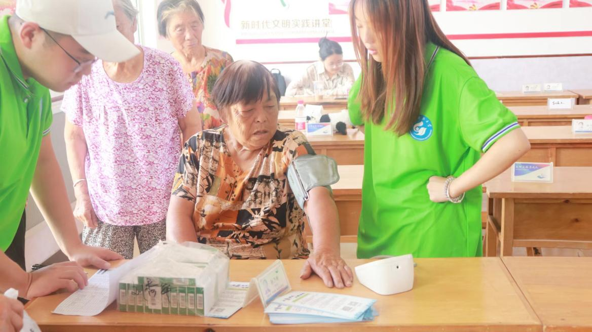 在双石董家,志愿者们为村里六十岁以上的老人进行血压、血糖检测和体重测量,同时在专业医生的指导下向有需要的老人发放药品,并将用药方法和剂量详细告知老人,确保安全用药。