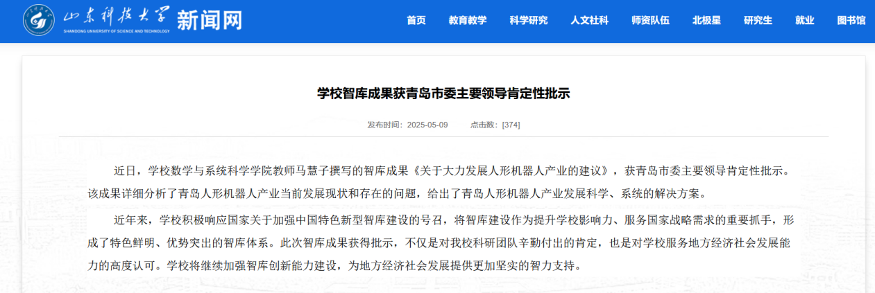 教师智库成果获青岛市委主要领导肯定性批示