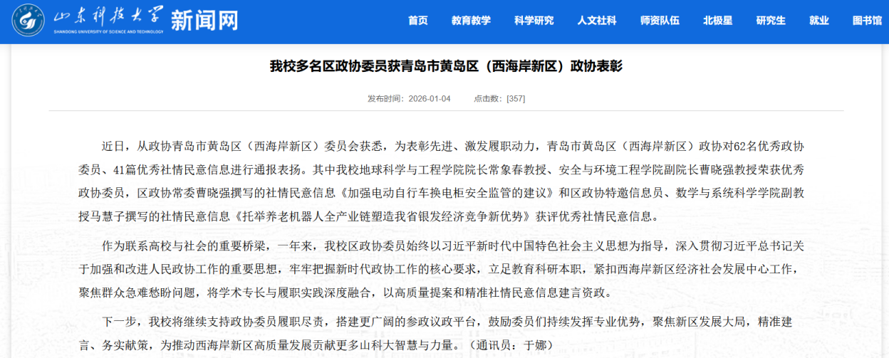 教师撰写社情民意获评青岛市黄岛区(西海岸新区)政协优秀社情民意信息